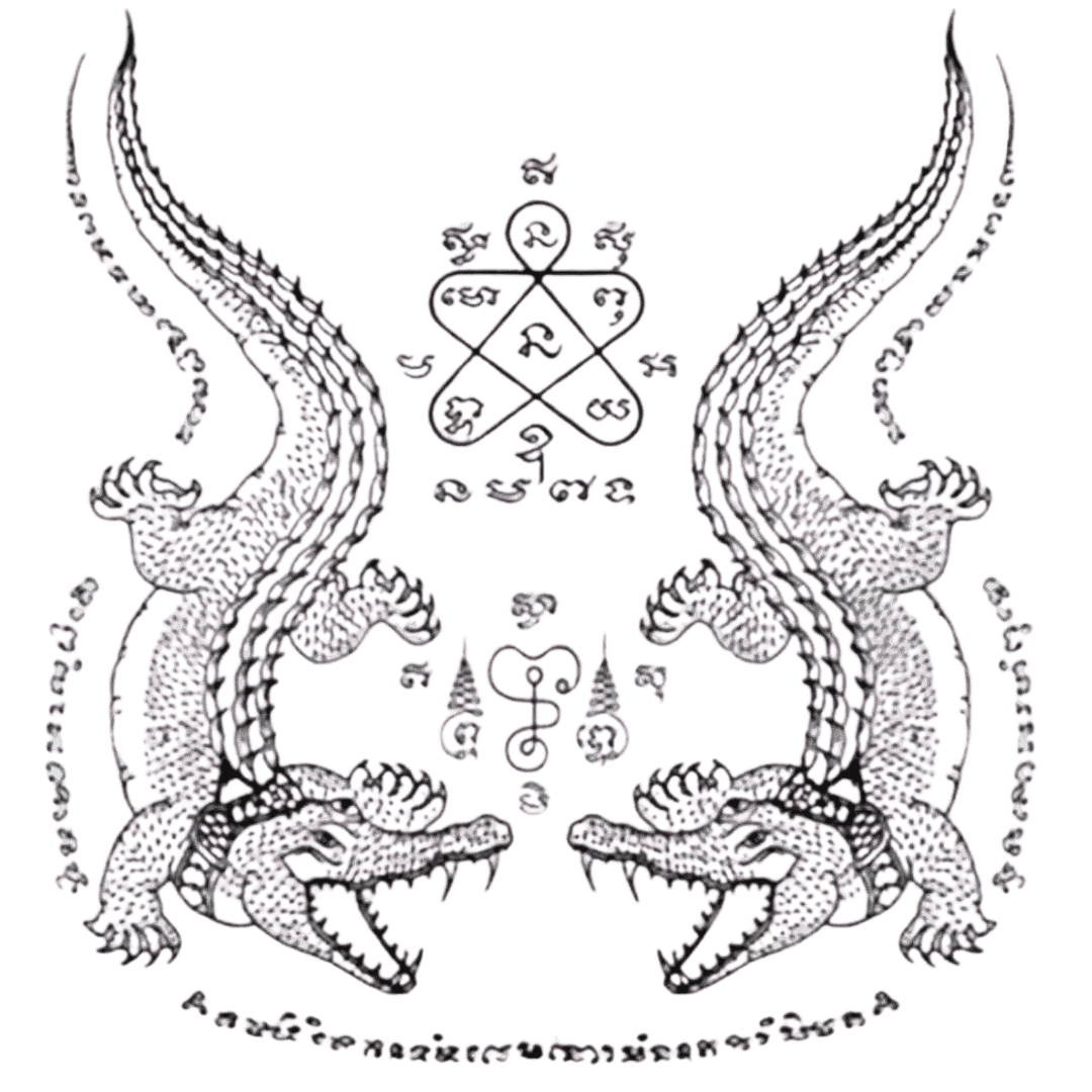 The Crocodile Sak Yant represents raw power, authority, fearlessness, and survival. In traditional Sak Yant belief, the crocodile is a symbol of dominance and unwavering strength, respected for its patience, precision, and ability to strike decisively when required.